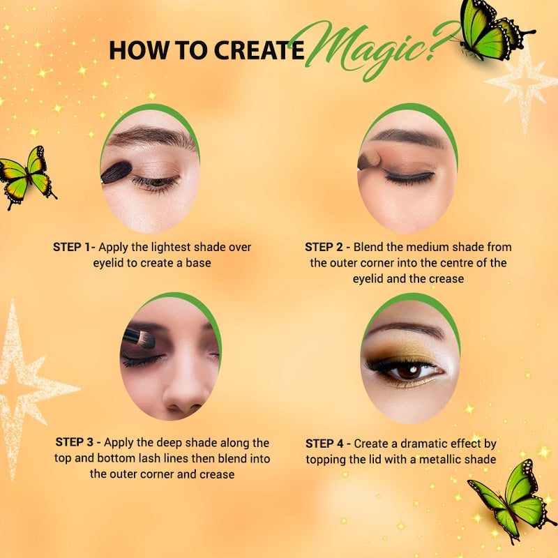 Apply the lightest shade over the entire eyelid to create a base. Blend the medium shade from the outer corner into the centre of the eyelid and the crease Apply the deep shade along the top and bottom lash lines and blend into the outer corner and crease. Create the drama effect by topping the lid with the Shimmer/ Metallic shade to finish the look. Pro-tips for your Eyeshadow: Blending is the key to apply eyeshadow. Make sure that there are no harsh lines and hence a smooth transition between two shades.