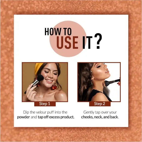 Dip the velour puff into the powder and tap off excess product. Gently tap over your cheeks, neck, and back.