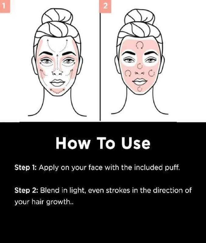 Apply on your face with the included puff. Blend in light, even strokes in the direction of your hair growth.