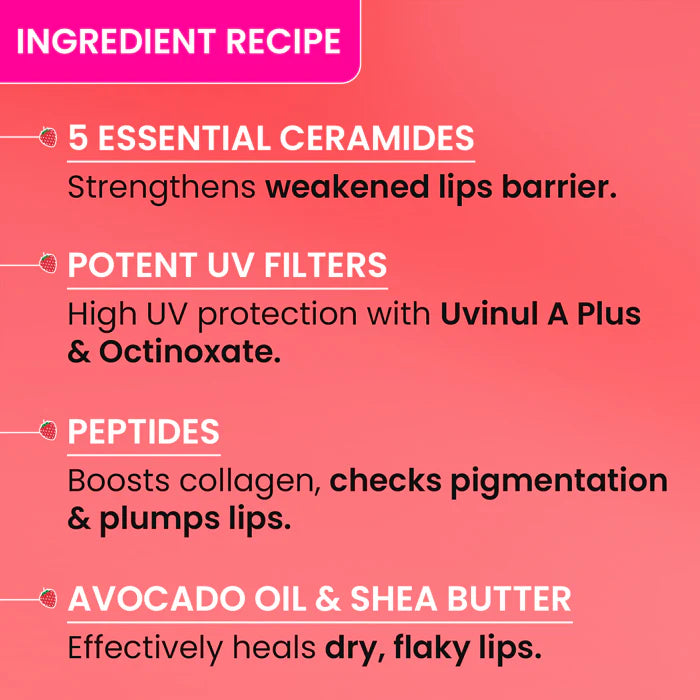 Ricinus Communis Seed Oil, Bis-Diglyceryl Polyacyladipate-2, Ethylhexyl Methoxycinnamate, Diethylamino Hydroxybenzoyl Hexyl Benzoate, Hydrogenated Soy Polyglycerides (and) C15-23 Alkanes, Hydrogenated Polyisobutene, Sorbitan Olivate, Ethylhexyl Triazone, Color, Laminaria Digitata Extract (and) Hydrogenated Lecithin (and) Cetyl-PG Hydroxyethyl Palmitamide (and) Ceramide 1,2,3,4,6II, Cholesterol, 1,2-Hexanediol, Persea Gratissima (Avocado) Oil, Aqua, Acetyl Hexapeptide-8 (and) Caprylyl Glycol, Ascorbyl Palmitate, Tocopheryl Acetate, Butyrospermum Parkii (Shea) Butter, Theobroma Cacao Seed Butter, Pentaerythrityl Tetra-Di-T-Butyl Hydroxyhydrocinnamate, Sucralose, Flavour, Phenoxyethanol.