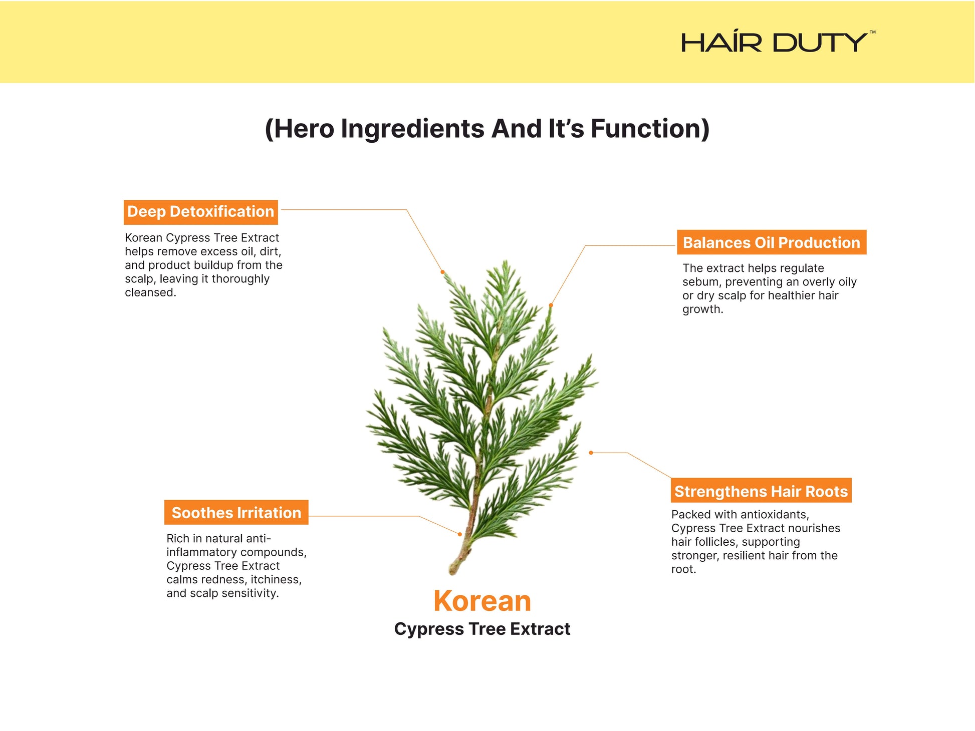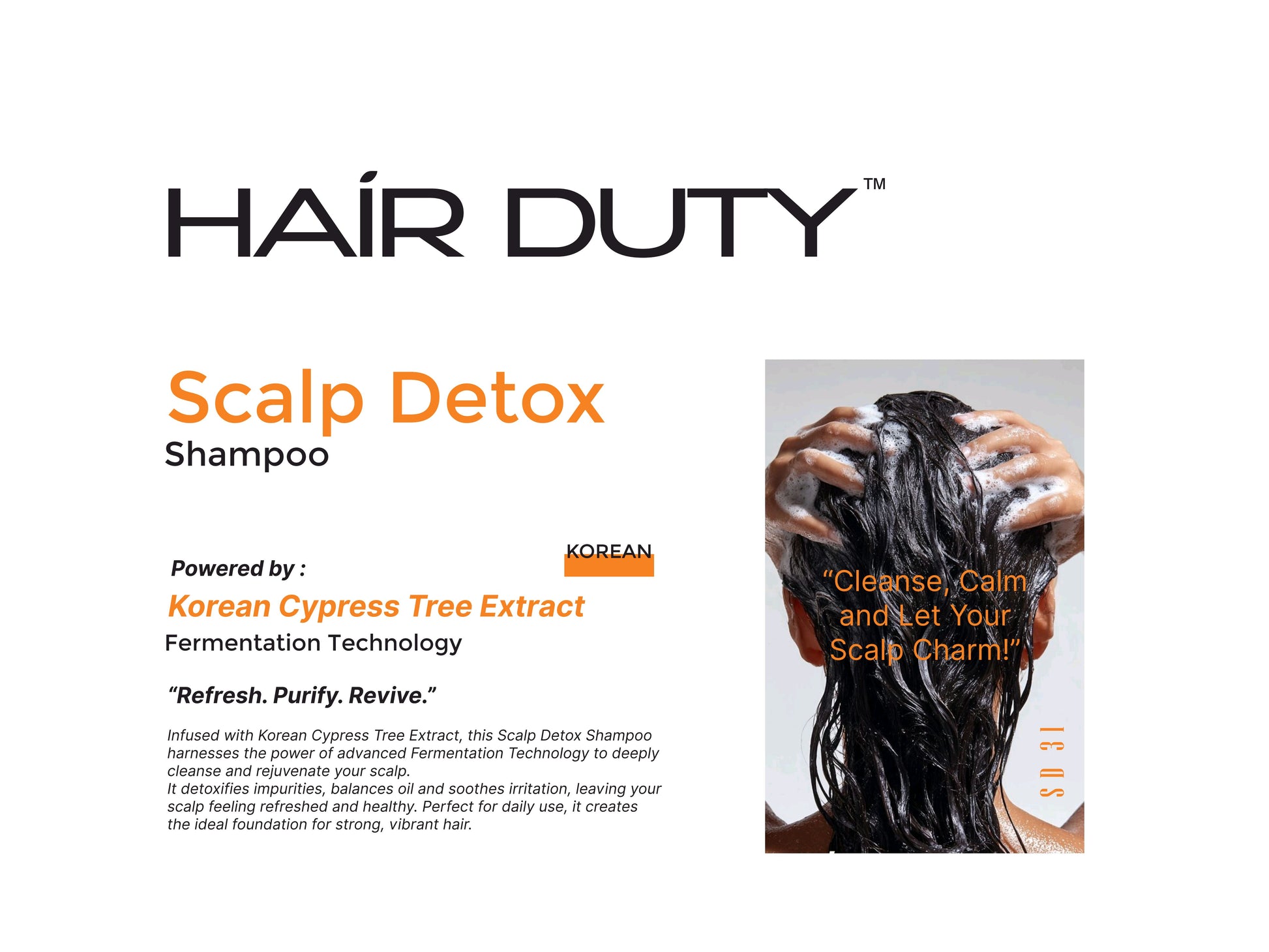 Hair Duty Scalp Detox Shampoo is a gentle yet effective cleansing shampoo designed to deeply detoxify the scalp while maintaining healthy, balanced hair. Powered by Korean fermentation technology and Cypress Tree Extract, this shampoo helps remove product buildup, excess oil, and impurities from the scalp, leaving it refreshed, clean, and revitalized.