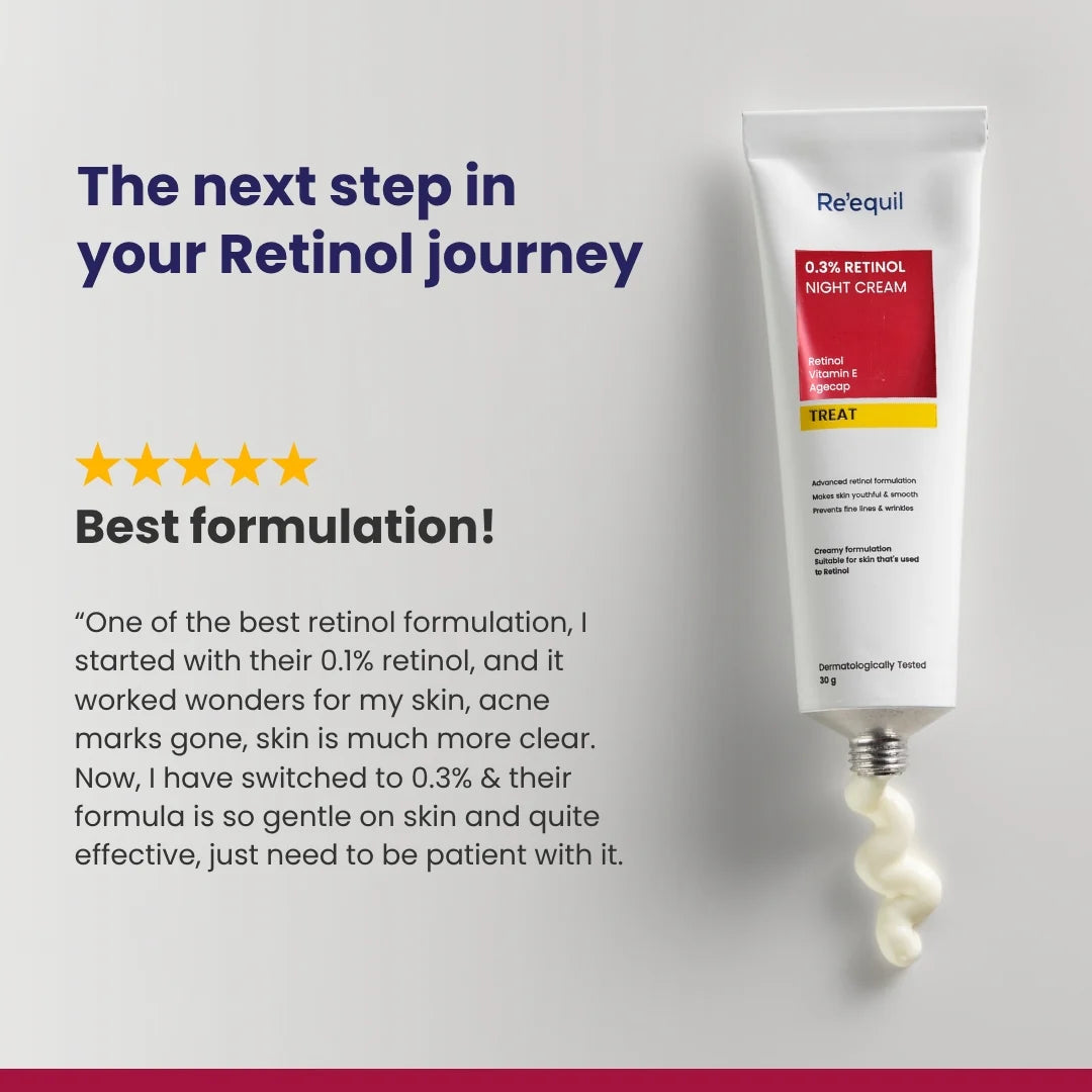 Re'equil 0.3% Retinol Night Cream is an intermediate-strength Retinol for skin with pre-exposure to Retinol. It offers adequate retinol concentration with a soothing and hydrating formulation. It has a blend of high potent ingredients and bio-retinol that increases skin cell turnover, neutralises free radical damage, and improves the texture and firmness of the skin. Consistent usage in your nighttime skincare routine helps reduce the appearance of fine lines, wrinkles, dullness, and uneven skin tone.